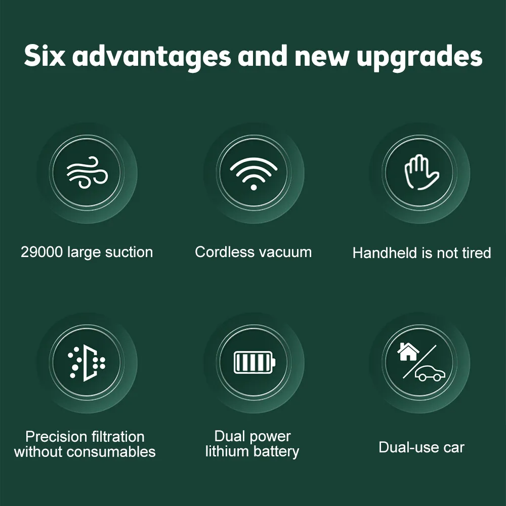 Discover the Power of Portability: Experience exceptional cleaning across multiple surfaces with our 29000PA Cordless Handheld Vacuum Cleaner. Perfect for homes, cars, and offices, it effortlessly handles dust, pet hair, and liquids.